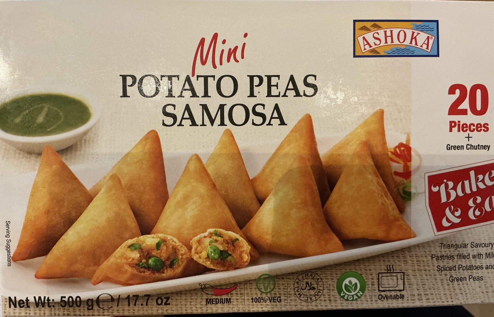 Ashoka Mini Kartoffel & Ærte Samosa er sprøde, små indiske snacks fyldt med en krydret blanding af kartofler og grønne ærter. De små samosaer er pakket ind i en tynd dej af hvedemel og krydret med traditionelle krydderier som spidskommen, koriander og chili, hvilket gør dem til en populær snack eller forret. Typiske ingredienser inkluderer hvedemel, kartofler, grønne ærter, vegetabilsk olie, løg og krydderier. Ernæringsmæssigt giver en portion (ca. 100 g) omkring 250–300 kcal, 30–35 g kulhydrater, 4–6 g protein, 12–16 g fedt og cirka 3–4 g kostfibre