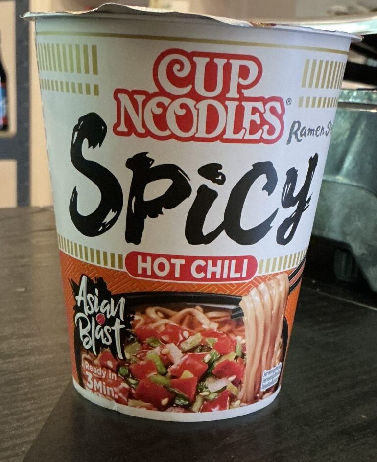 An intense and spicy cup noodle experience with authentic hot chili flavor, crafted to deliver heat and depth in every bite. Perfect for quick meals, lunch breaks, or a flavorful snack that excites the senses. Ingredients include wheat noodles, vegetable oil, dehydrated vegetables (carrot, spring onion, corn), spice mix with chili powder, garlic powder, ginger, soy sauce powder, and salt. Nutritional facts per serving (~70 g): energy ~310 kcal, fat ~12 g (of which saturated ~5 g), carbohydrates ~44 g (of which sugar ~2 g), protein ~7 g, salt ~3 g. This cup noodle provides a quick, spicy, and satisfying flavor experience without compromising ingredient quality
