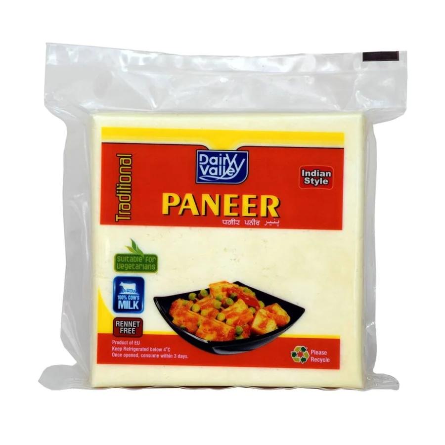 Dairy Valley Paneer er en frisk, blød og fast indisk ost lavet af frisk, fuldfed komælk, der koaguleres med naturlige syrer og formes omhyggeligt for at bevare sin milde smag og cremede tekstur. Paneeren er helt uden konserveringsmidler og tilsætningsstoffer og er perfekt til saftige karryretter, tandoori-retter eller at stege let på panden. Ingredienserne omfatter frisk komælk og citronsaft eller yoghurt til koagulering. Næringsindhold pr. 100 g: Energi ~265 kcal, Fedt ~20 g (heraf mættet ~12 g), Kulhydrater ~2 g, Protein ~18 g, Salt ~0,5 g. Paneer leverer en autentisk, mild smagsoplevelse og høj kvalitet, ideel til traditionelle indiske retter.