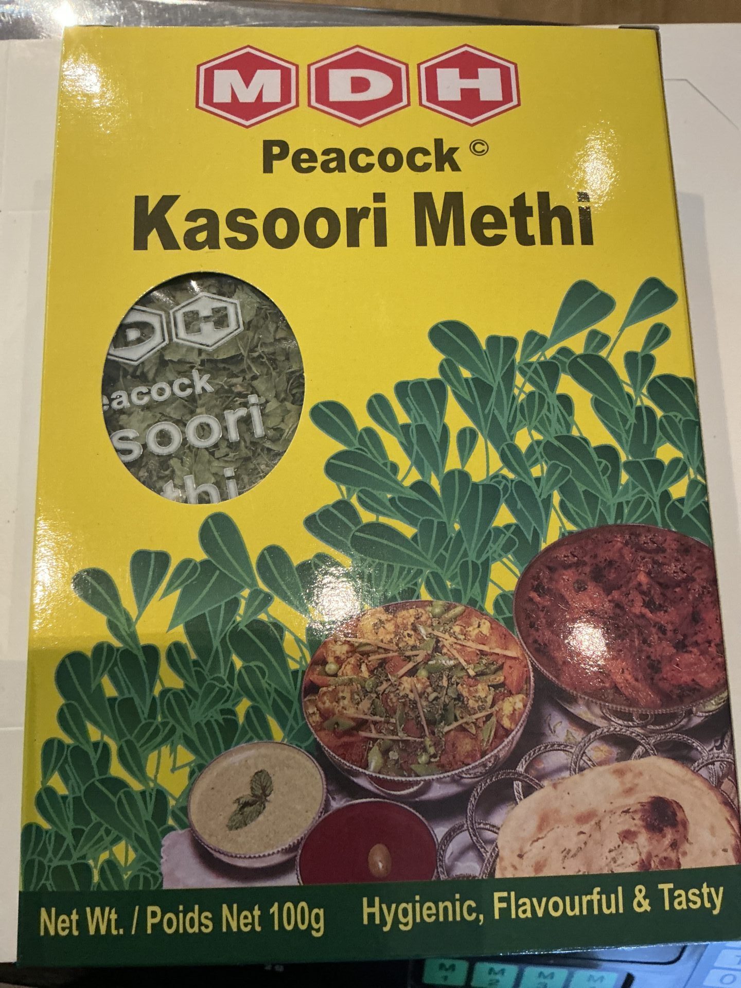 MDH Peacock Kasoori Methi er lavet af 100 % tørrede bukkehornsblade (kasoori methi), omhyggeligt udvalgt og lufttørret for at bevare den autentiske aroma og dybe, lidt bitre, nøddeagtige smag, som løfter enhver karry, dal, grøntsagsret eller indisk brød som naan og paratha. Produktet indeholder kun naturlige tørrede blade uden tilsatte farvestoffer eller konserveringsmidler. Næringsindholdet pr. 100 g viser en energi på ca. 323–325 kcal, omkring 6 g fedt, 40–58 g kulhydrater, 23–29 g protein og ingen tilsat salt eller sukker, hvilket gør det til et aromatisk og velsmagende krydderi, der bidrager med både smag og fibre til dine retter. Denne premium-kvalitet kasoori methi er et must‑have i køkkenet og giver konsistent autenticitet og aroma til traditionel indisk madlavning uden kunstige ingredienser.