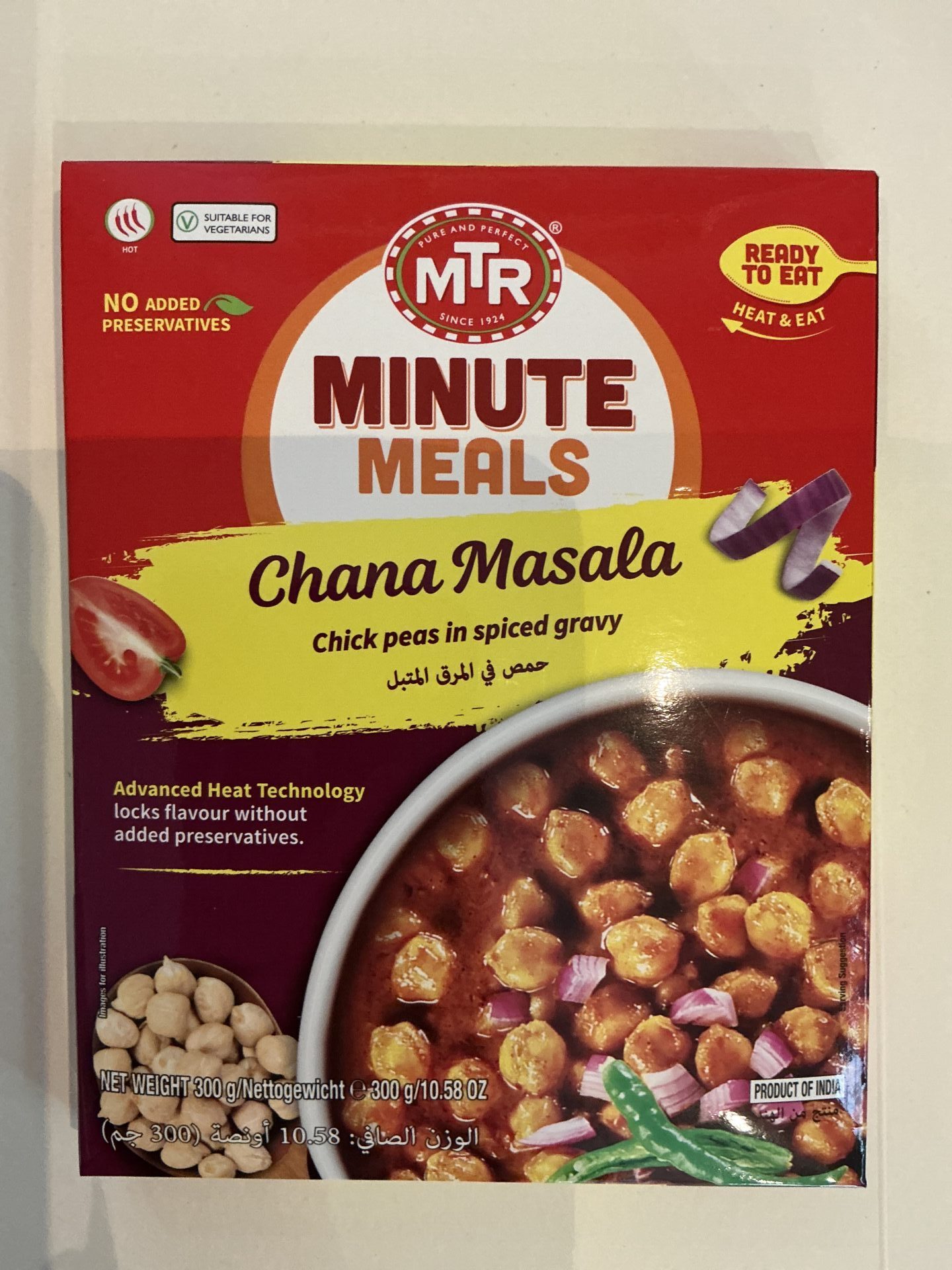 MTR Chana Masala is a ready‑to‑eat Indian chickpea curry that delivers authentic North Indian flavour in minutes — just heat and enjoy with rice, roti or bread. Made from wholesome chickpeas in a rich tomato‑onion gravy seasoned with ginger, garlic, coriander, fenugreek and carefully selected spices for a balanced, medium‑spiced taste. Ingredients:Chickpeas, Water, Onion, Refined Sunflower Oil, Tomato Paste, Garlic Paste, Ginger, Salt, Green Chilli, Dry Mango Powder, Black Salt, Mint Leaves and Traditional Indian Spices. Nutrition (approx. per 150 g serving): ~173 kcal energy, ~9 g fat, ~18 g carbs, ~5 g protein, ~5 g sugars and ~904 mg sodium. Premium quality ingredients deliver rich taste and convenience.