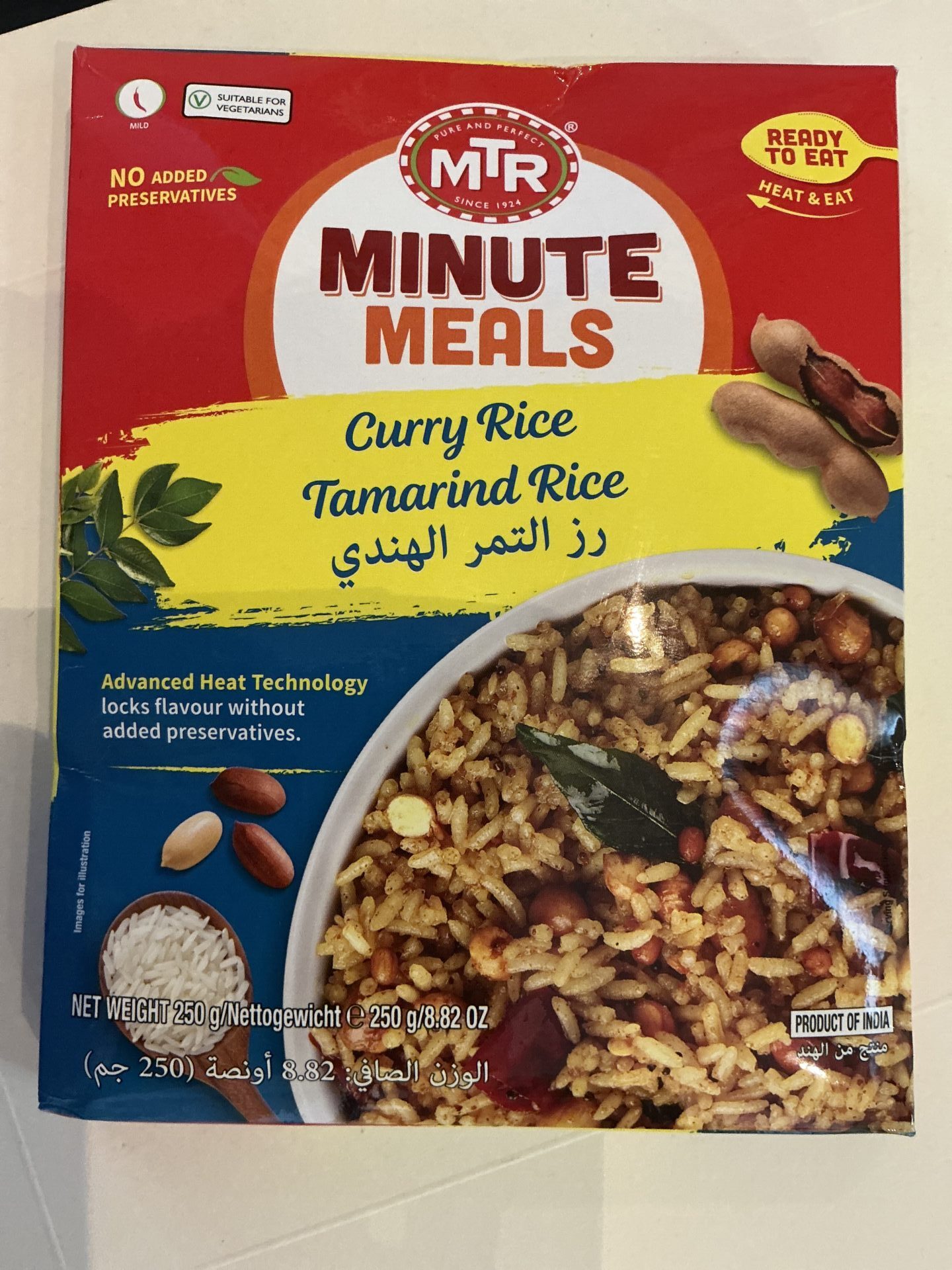 English: A fragrant and flavorful ready‑to‑eat rice dish with tamarind and Indian spices, ideal for quick meals or as a complement to your favourite dishes. The product includes water, rice (~35 %), refined sunflower oil, tamarind juice (~4 %), grated coconut, tomato paste, salt, sugar, jaggery, peanut, curry leaves, red chilli, sesame, mustard, mixed spices, chickpea splits and dal flour, black gram dal flour, fenugreek, asafoetida, acidity regulator (E334) and anti‑caking agent (E551). Nutritional facts per 100 g: energy approx. 811 kJ/194 kcal, fat approx. 6 g (of which saturates ~1 g), carbohydrates approx. 32 g (of which sugars ~2.5 g), protein approx. 3 g, salt approx. 1 g. A convenient, vegetarian meal with an authentic South Indian taste, crafted under standard food safety practices for a consistent and delicious experience