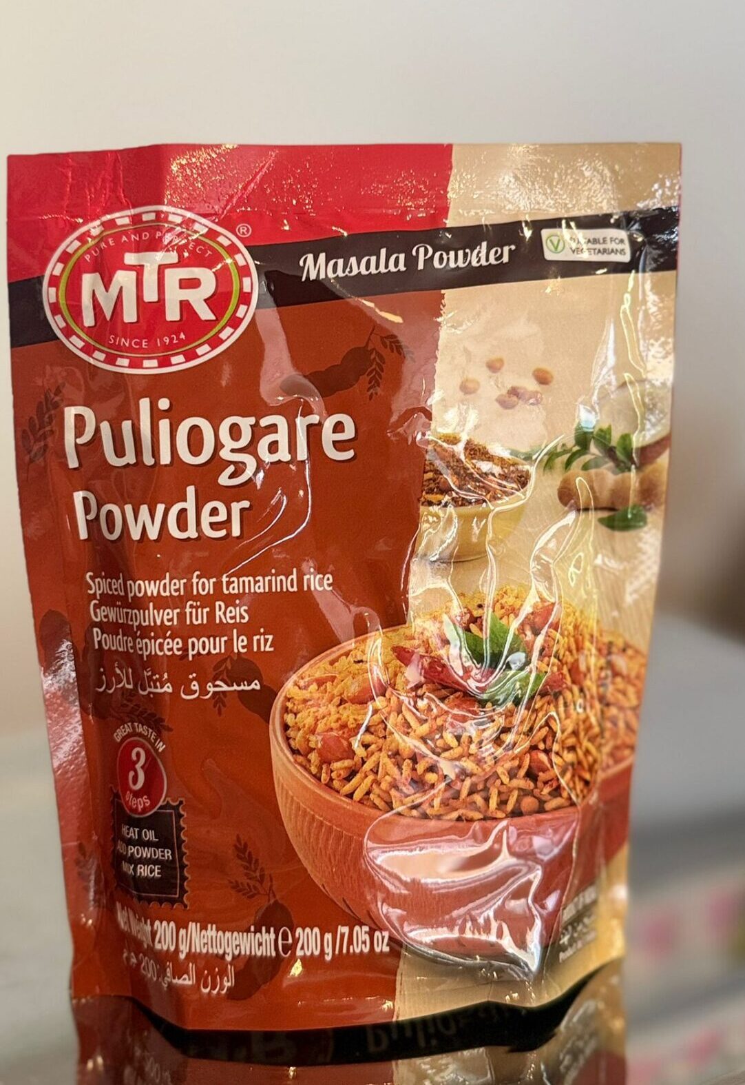 MTR Masala Puliyogare Powder is an aromatic spice blend for puliyogare (tamarind rice), carefully selected to deliver an authentic tangy and mildly spicy flavor with hints of tamarind, peanuts, and traditional South Indian spices. Ingredients include tamarind concentrate, sugar, peanuts, coconut, coriander, red chilli, curry leaves, sesame, mustard, black pepper, fenugreek, gram dal, black gram dal and other herbs and spices, ensuring a deep, traditional taste in every serving. Nutritional facts per 100 g provide approximately 337 kcal energy, 23 g fat, 41 g carbohydrates, and 8 g protein, making this masala a rich and flavourful addition to rice dishes while maintaining the quality and consistency expected from a classic ingredient in Indian cooking