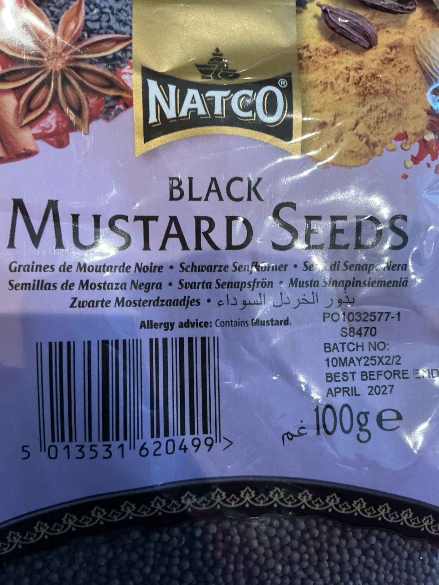 English: Highly aromatic whole mustard seeds of premium quality, carefully selected and dried to preserve their natural scent and robust, slightly pungent flavour – ideal for adding bold character to curries, pickles, chutneys and warm Indian‑style dishes; the ingredient list consists solely of whole black mustard seeds with no added fillers or preservatives, ensuring pure, authentic spice quality and consistent aroma every time. Naturally rich in dietary fibre and plant protein, they provide about 500 kcal per 100 g with ~36 g fat (of which ~2 g saturated), ~28 g carbohydrates (of which ~7 g sugars), ~26 g protein and ~12 g fibre, with very low salt – a nutrient‑dense foundation for your cooking and healthier seasoning