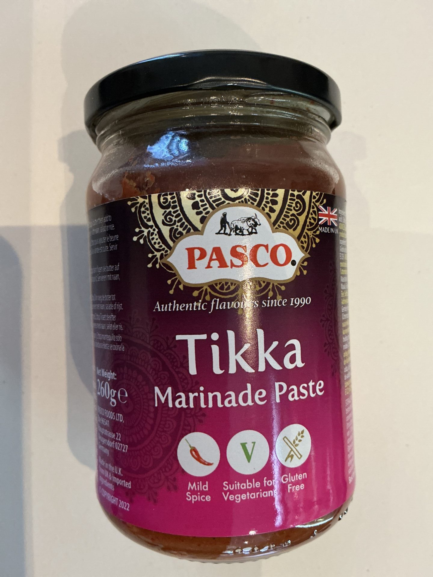 Dansk: Pasco Tikka Marinade Paste er en aromatisk og velsmagende marinade‑ og madlavningspasta, lavet med koriander, vand, rapsolie, hvidløg, ingefær, tomatpasta, salt, gurkemeje, chilipulver, garam masala, spidskommen og naturlige syrer og farver, der giver en autentisk Tikka‑smag og dybde til dit kød, grøntsager eller gryderetter; pastaen indeholder pr. 100 g ca. 960 kJ/231 kcal energi, 17,4 g fedt (heraf 1,1 g mættede fedtsyrer), 13,2 g kulhydrat (heraf 6,6 g sukker), 3,6 g protein og 2,6 g salt, og den er glutenfri og velegnet til vegetariske retter, hvilket gør den til et kvalitetsprodukt, der leverer en rig, krydret smag med en stabil konsistens og aroma til traditionelle indiske retter som Tikka Masala eller grillmarinader.