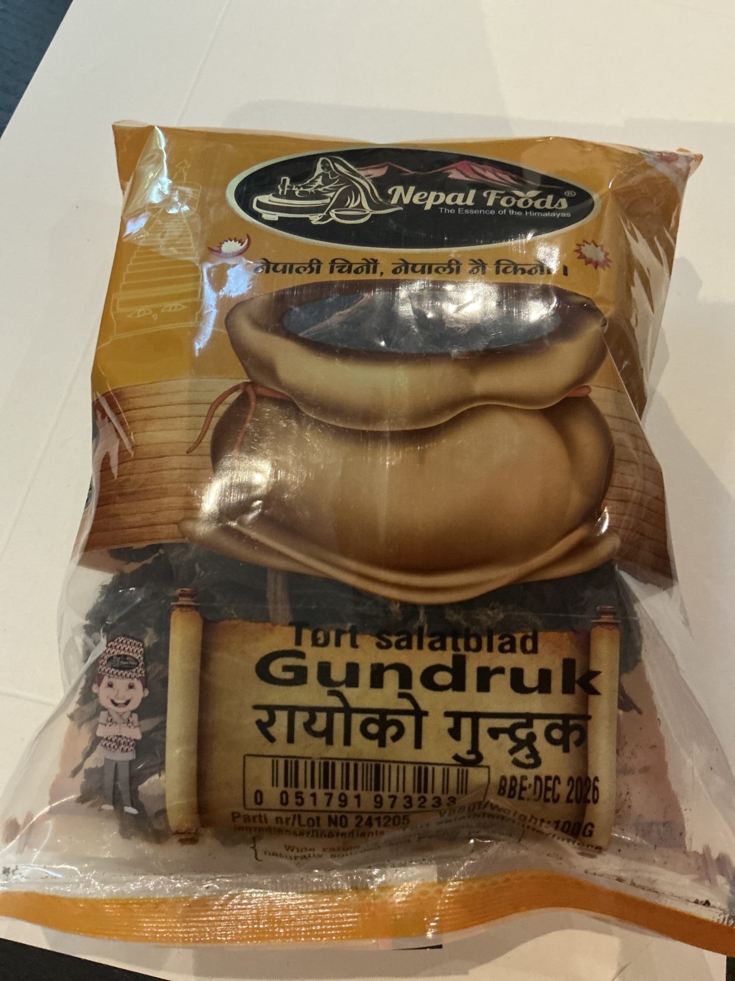 Dansk: Rayo Ko Gundruk er et traditionelt nepalesisk fermenteret og tørret bladgrøntsagsprodukt lavet af rayo‑saag (bladgrøntsager som radise‑, spinat‑ og blomkålsblade) gennem en naturlig fermenteringsproces, der giver en karakteristisk syrlig aroma og dyb smag; ingredienserne er primært radiseblade, spinatblade og blomkålsblade, og ernæringsindholdet pr. ca. 100 g omfatter energi ~120 kcal, fedt ~1,5 g (heraf mættet ~0,85 g), kulhydrater ~22 g, kostfibre ~6 %, sukker ~1 %, protein ~8 g samt lavt natriumindhold ~30 mg — en nærende, smagfuld og naturligt fremstillet ingrediens, der forbedrer traditionelle retter med sin autentiske, fermenterede karakter.