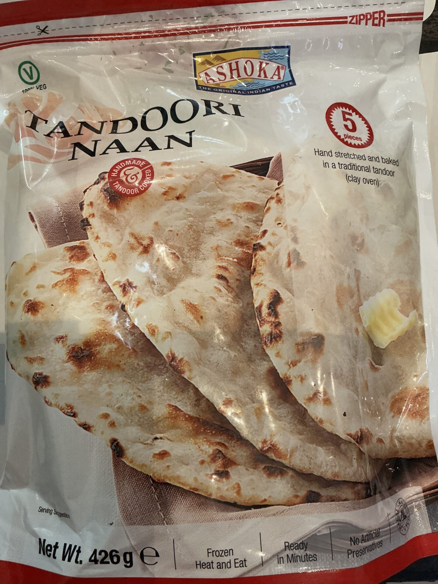 English: Ashoka Tandoori Naan is a traditional Indian flatbread baked in a tandoor oven, made from wheat flour, water, sunflower oil, salt, sugar, yeast and leavening agent (E500) to deliver a soft, airy texture and authentic flavour, with approximately 324 kcal, 6.8 g fat (of which 1.3 g saturated), 55 g carbohydrates (of which 5.9 g sugars), 8.1 g protein and 0.06 g salt per 100 g, ideal for pairing with curries, dals, and grilled dishes, bringing classic Indian taste and consistency to your meals