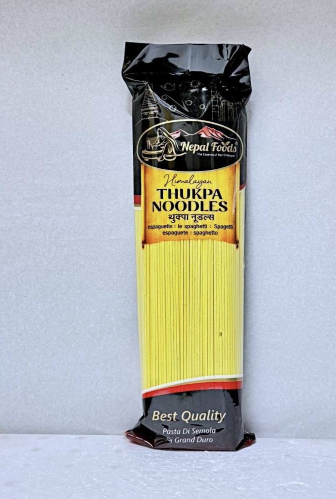 Thukpa-nudler er lavet af kvalitetsfuldkornshvedemel og vand, omhyggeligt fremstillet for at bevare deres bløde tekstur og naturlige smag. Perfekte til varme supper, wokretter og krydrede bouillons, giver de en autentisk tibetansk/nordindisk oplevelse med hver bid. Ingredienser: hvedemel, vand, salt, vegetabilsk olie; Næringsindhold pr. 100 g: energi 350 kcal, fedt 3 g, mættet fedt 0,5 g, kulhydrater 70 g, sukker 2 g, protein 10 g, salt 1,2 g.